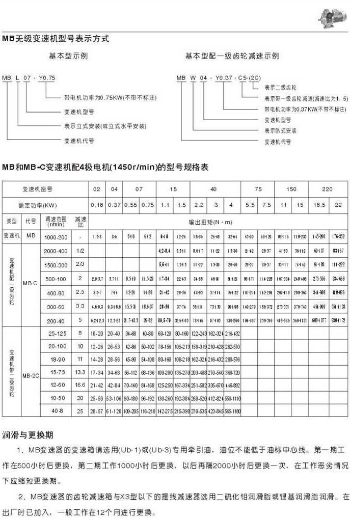 MB無級變速機型號表示法MB和MB-C變速機配4極電機(1450r/min)的型號規(guī)格表潤滑和更換期
